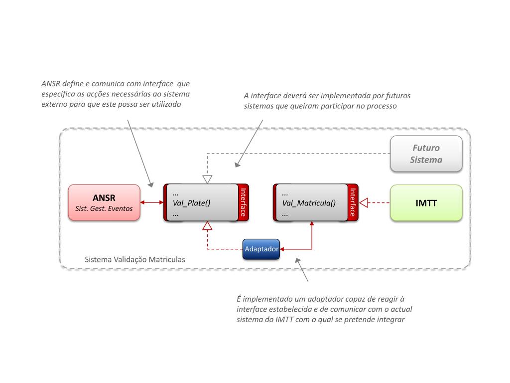 ANSR define e comunica com interface que especifica as acções necessárias ao sistema externo para que este possa ser utilizado A interface deverá ser implementada por futuros sistemas que queiram participar no processo Futuro Sistema Adaptador ANSR Sist. Gest. Eventos IMTT ... Val_Matricula() ... ... Val_Plate() ... Interface Interface Sistema Validação Matriculas É implementado um adaptador capaz de reagir à interface estabelecida e de comunicar com o actual sistema do IMTT com o qual se pretende integrar