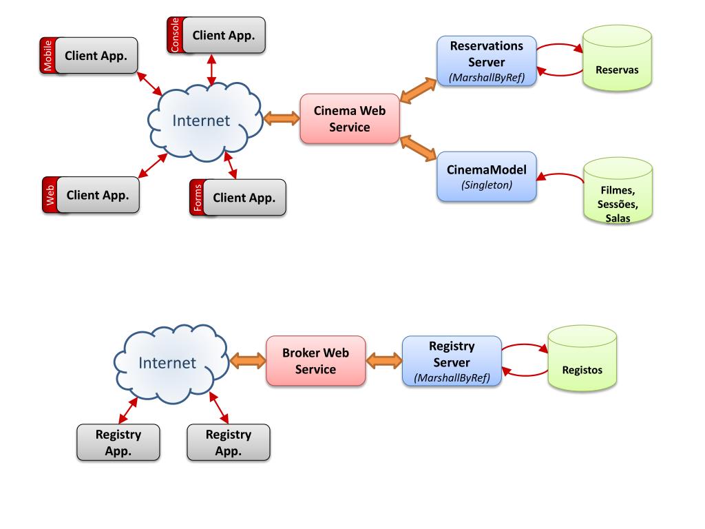 Reservas Reservations Server (MarshallByRef) Client App. Console Client App. Mobile Internet Cinema Web Service CinemaModel (Singleton) Filmes, Sessões, Salas Client App. Web Client App. Forms Internet Registos Broker Web Service Registry Server (MarshallByRef) Registry App. Registry App.