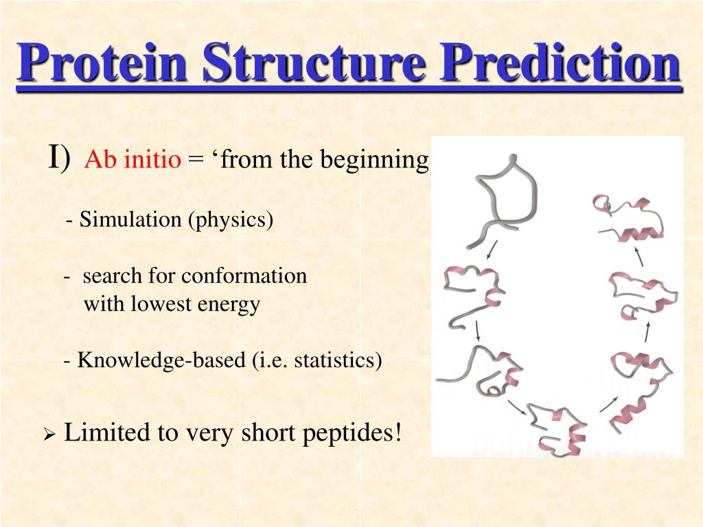 protein sequence: RGYSLGNWVC KVFGRCELAA AMKRHGLDNY AAKFESNFNT QATNRNTDGS TDYGILQINS RWWCNDGRTP GSRNLCNIPC SALLSSDITA SVNCAKKIVS DGNGMNAWVA WRNRCKGTDV I)Ab initio = ‘from the beginning’ - Simulation (physics) - search for conformation with lowest energy - Knowledge-based (i.e. statistics) Protein Structure Prediction • Limited to very short peptides!
