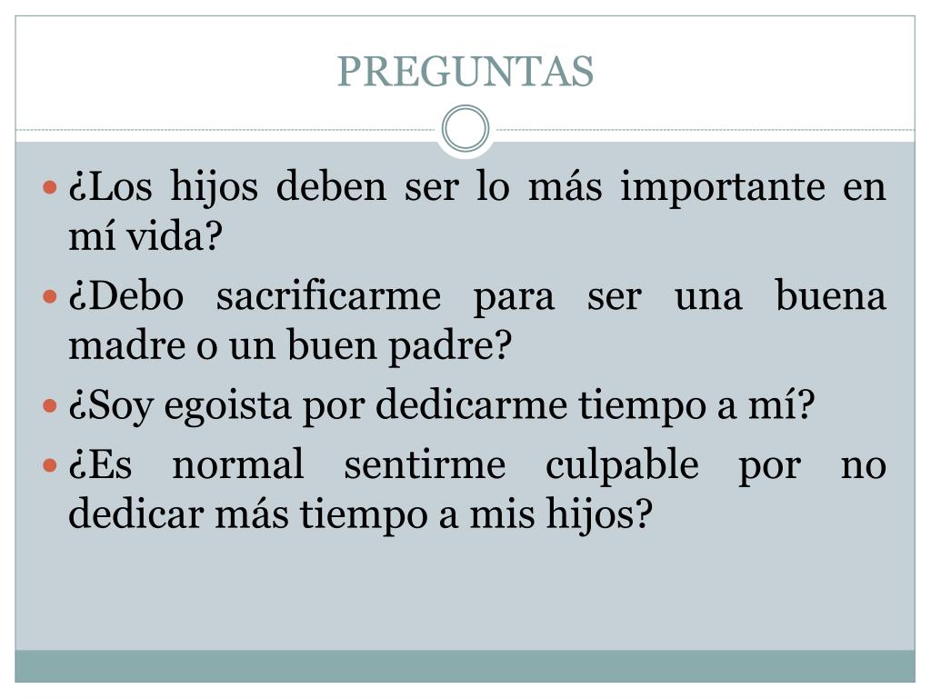 PREGUNTAS ¿Los hijosdeben ser lo másimportante en mívida? ¿Debosacrificarmepara ser unabuenamadre o un buen padre? ¿Soy egoistapordedicarmetiempo a mí? ¿Es normal sentirme culpable por no dedicarmástiempo a mishijos?