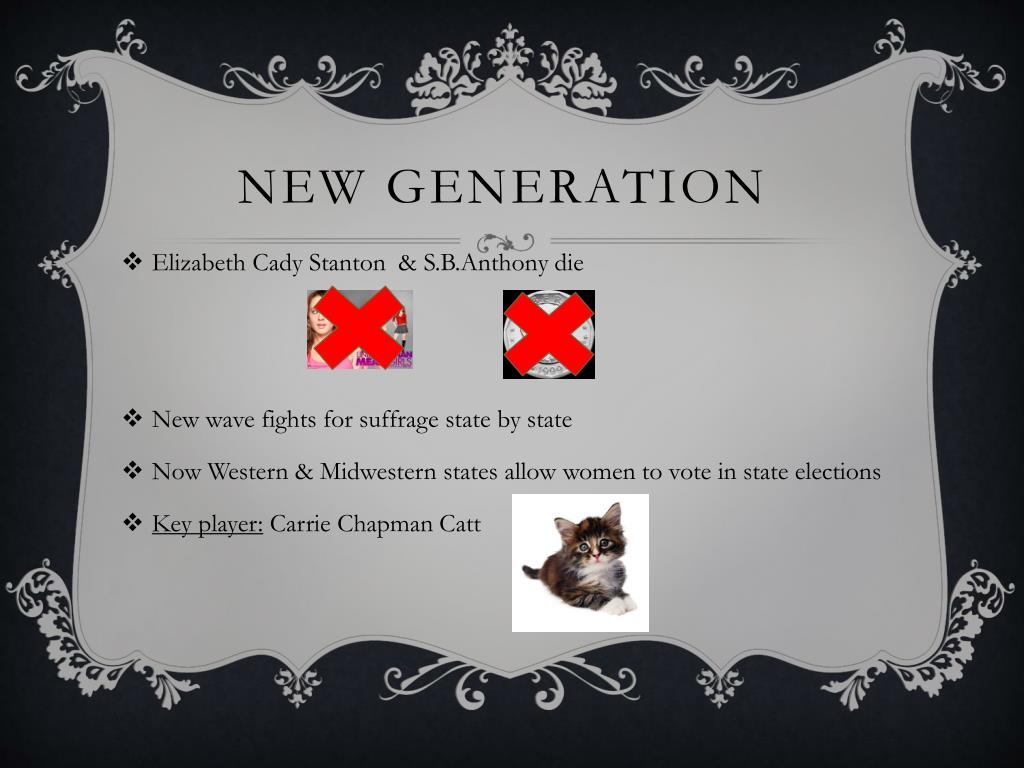 New generation • Elizabeth Cady Stanton & S.B.Anthony die • New wave fights for suffrage state by state • Now Western & Midwestern states allow women to vote in state elections • Key player: Carrie Chapman Catt