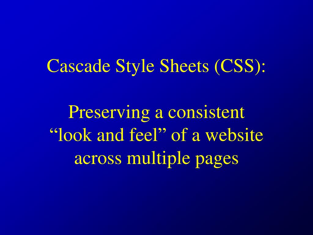 Lecture # 33 Cascade Style Sheets (CSS). Cascade Style Sheets (CSS): Preserving a consistent “ look and feel ” of a website across multiple pages. Content vs Style. Before version 4.0 of HTML, style information was intermixed with content. Version 4.0 and above separate HTML into