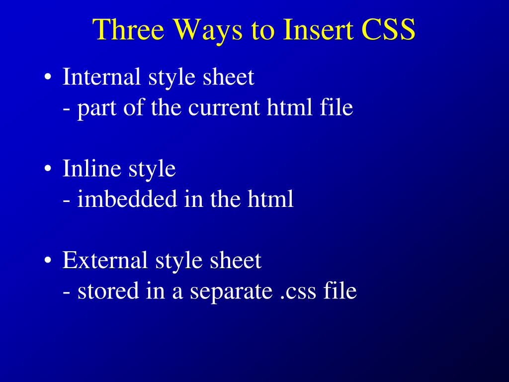 Three Ways to Insert CSS • Internal style sheet - part of the current html file • Inline style - imbedded in the html • External style sheet - stored in a separate .css file