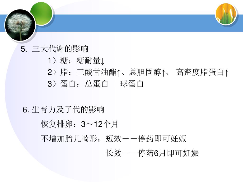 5. 三大代谢的影响 1)糖:糖耐量↓ 2)脂:三酸甘油酯↑、总胆固醇↑、 高密度脂蛋白↑ 3)蛋白:总蛋白 球蛋白 6. 生育力及子代的影响 恢复排卵:3~12个月 不增加胎儿畸形:短效--停药即可妊娠 长效--停药6月即可妊娠