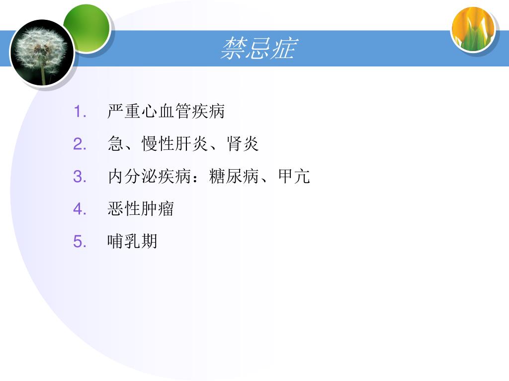 禁忌症 • 严重心血管疾病 • 急、慢性肝炎、肾炎 • 内分泌疾病:糖尿病、甲亢 • 恶性肿瘤 • 哺乳期