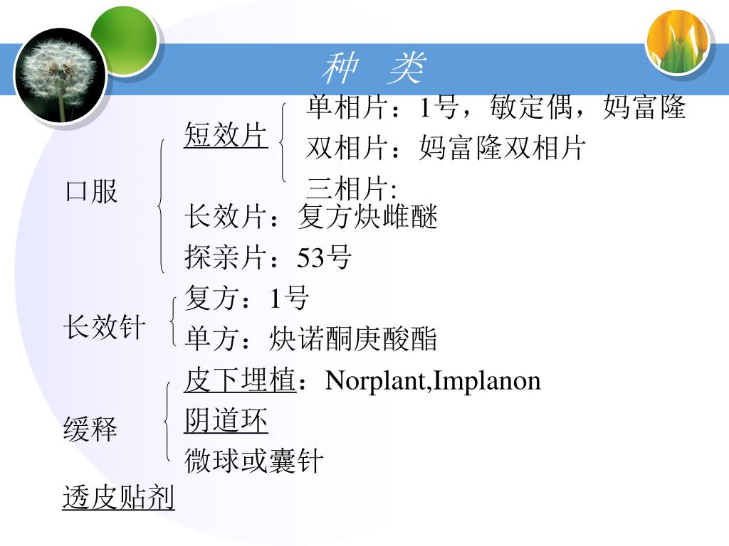 种 类 单相片:1号,敏定偶,妈富隆 双相片:妈富隆双相片 三相片: 短效片 长效片:复方炔雌醚 探亲片:53号 复方:1号 单方:炔诺酮庚酸酯 皮下埋植:Norplant,Implanon 阴道环 微球或囊针 口服 长效针 缓释 透皮贴剂