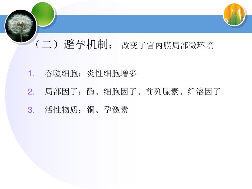 (二)避孕机制:改变子宫内膜局部微环境 • 吞噬细胞:炎性细胞增多 • 局部因子:酶、细胞因子、前列腺素、纤溶因子 • 活性物质:铜、孕激素
