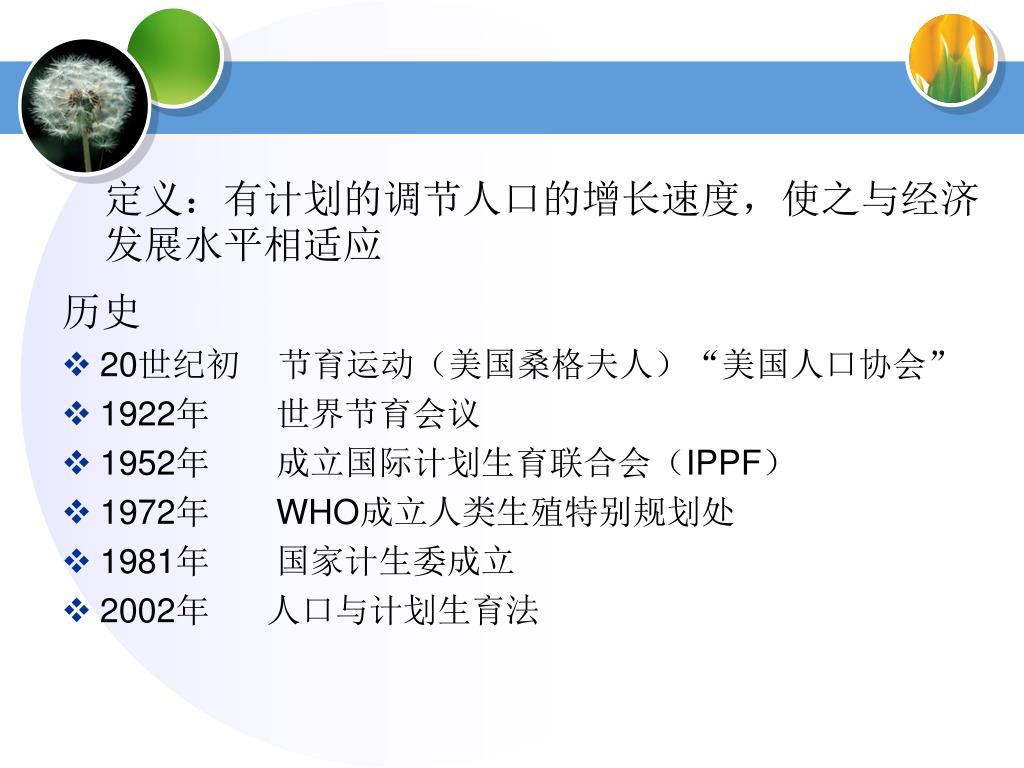 定义:有计划的调节人口的增长速度,使之与经济发展水平相适应定义:有计划的调节人口的增长速度,使之与经济发展水平相适应 历史 • 20世纪初 节育运动(美国桑格夫人)“美国人口协会” • 1922年 世界节育会议 • 1952年 成立国际计划生育联合会(IPPF) • 1972年 WHO成立人类生殖特别规划处 • 1981年 国家计生委成立 • 2002年 人口与计划生育法