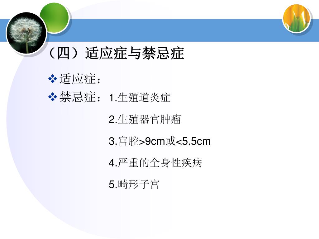 (四)适应症与禁忌症 • 适应症: • 禁忌症:1.生殖道炎症 2.生殖器官肿瘤 3.宫腔>9cm或<5.5cm 4.严重的全身性疾病 5.畸形子宫