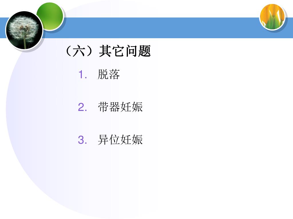 (六)其它问题 • 脱落 • 带器妊娠 • 异位妊娠