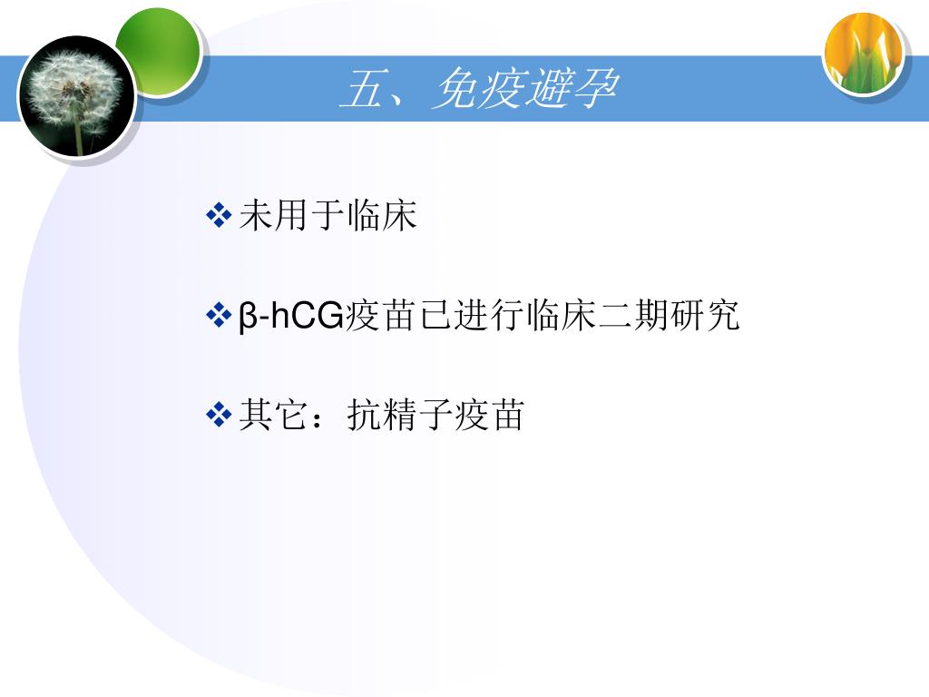 五、免疫避孕 • 未用于临床 • β-hCG疫苗已进行临床二期研究 • 其它:抗精子疫苗