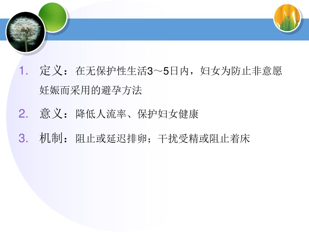定义:在无保护性生活3~5日内,妇女为防止非意愿妊娠而采用的避孕方法定义:在无保护性生活3~5日内,妇女为防止非意愿妊娠而采用的避孕方法 • 意义:降低人流率、保护妇女健康 • 机制:阻止或延迟排卵;干扰受精或阻止着床