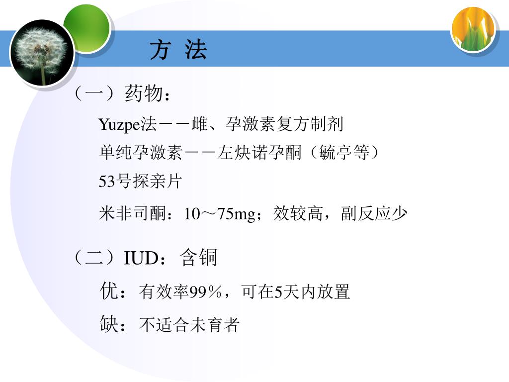 方 法 (一)药物: Yuzpe法--雌、孕激素复方制剂 单纯孕激素--左炔诺孕酮(毓亭等) 53号探亲片 米非司酮:10~75mg;效较高,副反应少 (二)IUD:含铜 优:有效率99%,可在5天内放置 缺:不适合未育者