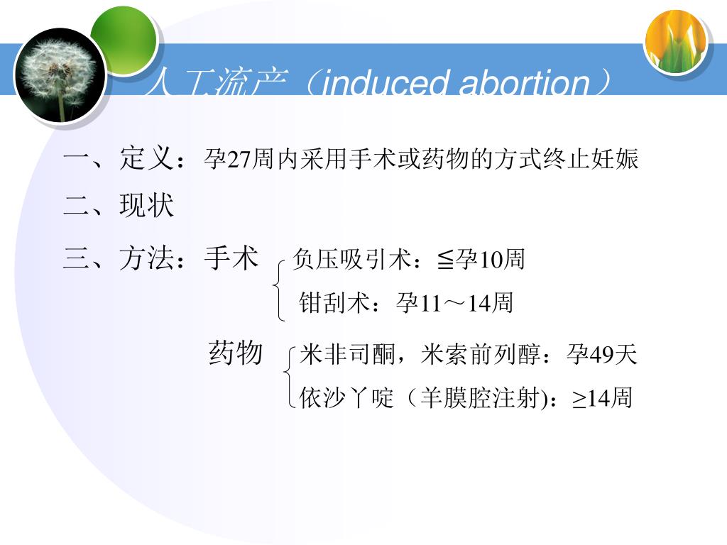 人工流产(induced abortion) 一、定义:孕27周内采用手术或药物的方式终止妊娠 二、现状 三、方法:手术 负压吸引术:≦孕10周 钳刮术:孕11~14周 药物 米非司酮,米索前列醇:孕49天 依沙丫啶(羊膜腔注射):≥14周