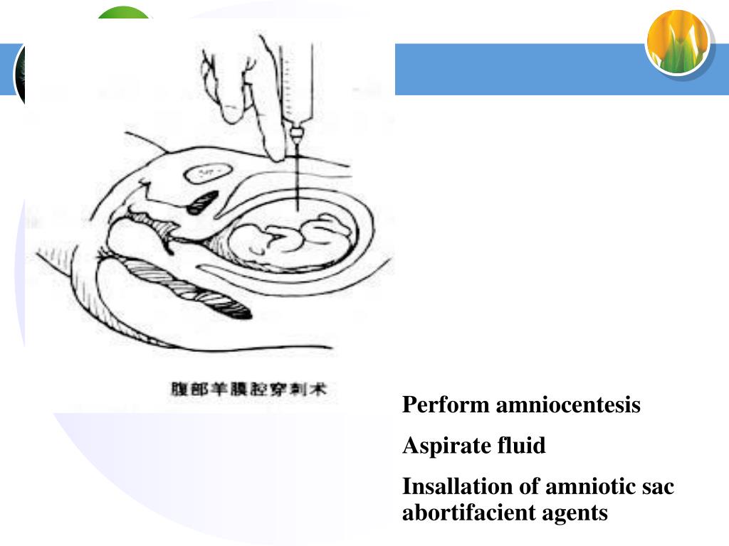 Perform amniocentesis Aspirate fluid Insallation of amniotic sac abortifacient agents