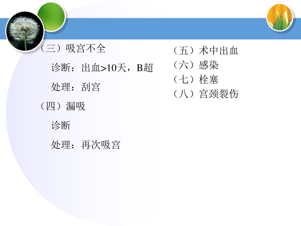 (五)术中出血 (六)感染 (七)栓塞 (八)宫颈裂伤 (三)吸宫不全 诊断:出血>10天,B超 处理:刮宫 (四)漏吸 诊断 处理:再次吸宫
