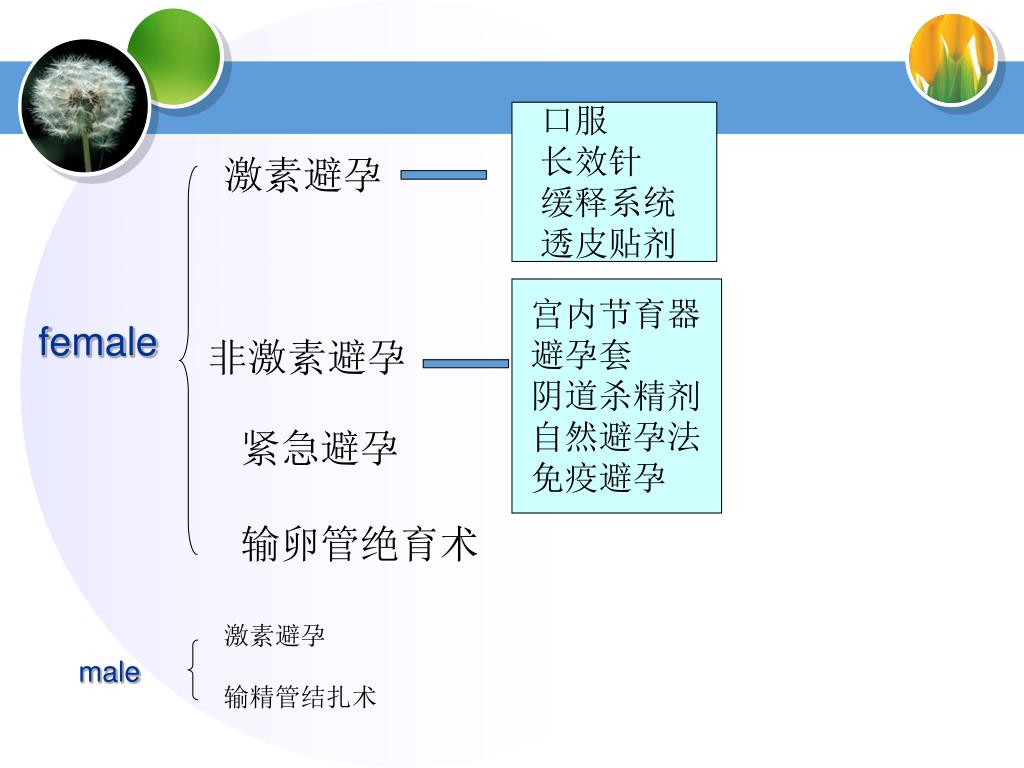口服 长效针 缓释系统 透皮贴剂 激素避孕 宫内节育器 避孕套 阴道杀精剂 自然避孕法 免疫避孕 female 非激素避孕 紧急避孕 输卵管绝育术 激素避孕 输精管结扎术 male