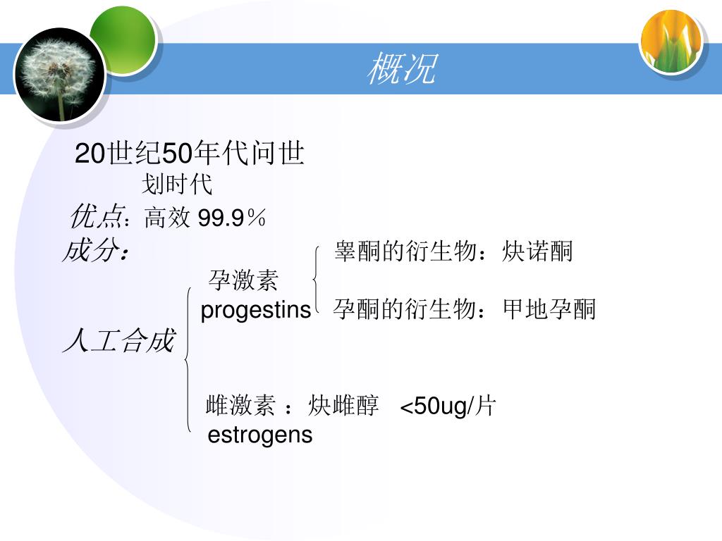概况 20世纪50年代问世 划时代 优点:高效 99.9% 成分:睾酮的衍生物:炔诺酮 孕激素 progestins 孕酮的衍生物:甲地孕酮 人工合成 雌激素 :炔雌醇 <50ug/片 estrogens