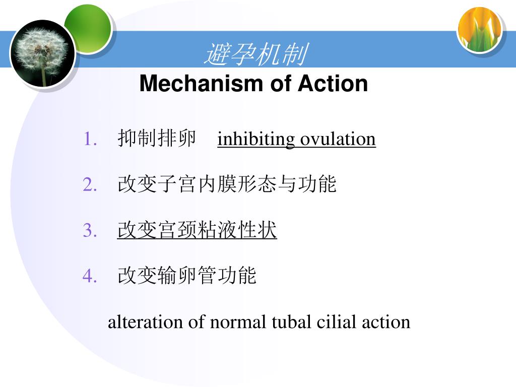 避孕机制 Mechanism of Action 抑制排卵 inhibiting ovulation 改变子宫内膜形态与功能 改变宫颈粘液性状 改变输卵管功能 alteration of normal tubal cilial action