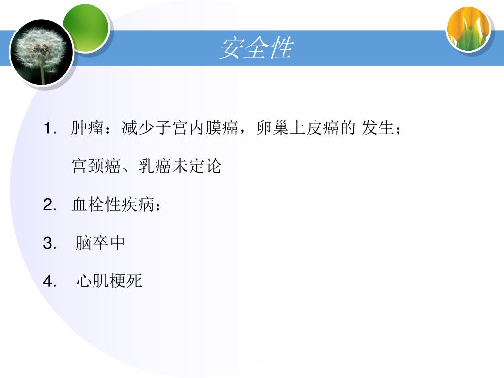 安全性 1. 肿瘤:减少子宫内膜癌,卵巢上皮癌的 发生; 宫颈癌、乳癌未定论 2. 血栓性疾病: 3. 脑卒中 4. 心肌梗死