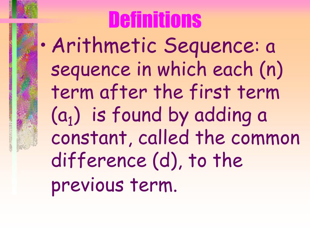 Definitions • Arithmetic Sequence: a sequence in which each (n) term after the first term (a1) is found by adding a constant, called the common difference (d), to the previous term.