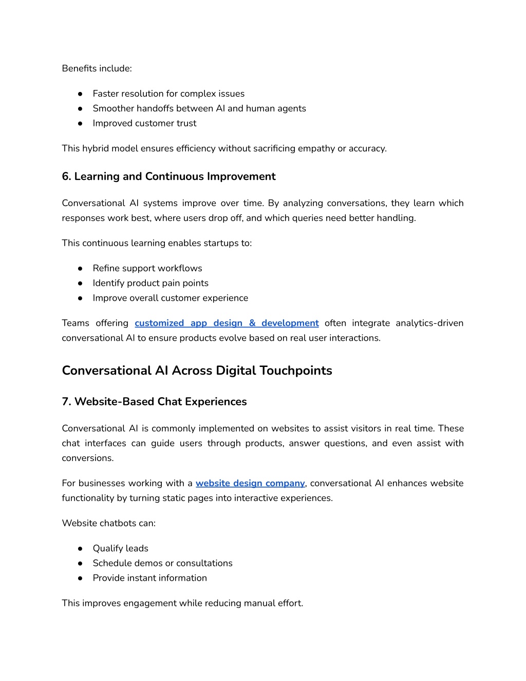 4. Benefits include: ● Faster resolution for complex issues ● Smoother handoffs between AI and human agents ● Improved customer trust This hybrid model ensures efficiency without sacrificing empathy or accuracy. 6. Learning and Continuous Improvement Conversational AI systems improve over time. By analyzing conversations, they learn which responses work best, where users drop off, and which queries need better handling. This continuous learning enables startups to: ● Refine support workflows ● Identify product pain points ● Improve overall customer experience Teams offering customized app design & development often integrate analytics-driven conversational AI to ensure products evolve based on real user interactions. Conversational AI Across Digital Touchpoints 7. Website-Based Chat Experiences Conversational AI is commonly implemented on websites to assist visitors in real time. These chat interfaces can guide users through products, answer questions, and even assist with conversions. For businesses working with a website design company, conversational AI enhances website functionality by turning static pages into interactive experiences. Website chatbots can: ● Qualify leads ● Schedule demos or consultations ● Provide instant information This improves engagement while reducing manual effort.