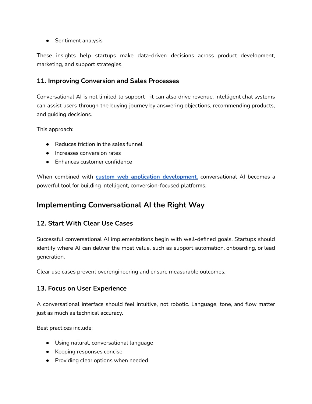 6. ● Sentiment analysis These insights help startups make data-driven decisions across product development, marketing, and support strategies. 11. Improving Conversion and Sales Processes Conversational AI is not limited to support—it can also drive revenue. Intelligent chat systems can assist users through the buying journey by answering objections, recommending products, and guiding decisions. This approach: ● Reduces friction in the sales funnel ● Increases conversion rates ● Enhances customer confidence When combined with custom web application development, conversational AI becomes a powerful tool for building intelligent, conversion-focused platforms. Implementing Conversational AI the Right Way 12. Start With Clear Use Cases Successful conversational AI implementations begin with well-defined goals. Startups should identify where AI can deliver the most value, such as support automation, onboarding, or lead generation. Clear use cases prevent overengineering and ensure measurable outcomes. 13. Focus on User Experience A conversational interface should feel intuitive, not robotic. Language, tone, and flow matter just as much as technical accuracy. Best practices include: ● Using natural, conversational language ● Keeping responses concise ● Providing clear options when needed