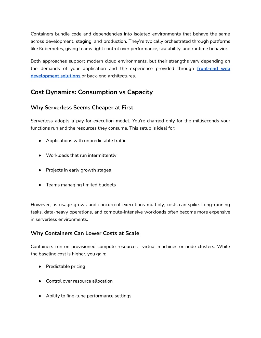 2. Containers bundle code and dependencies into isolated environments that behave the same across development, staging, and production. They’re typically orchestrated through platforms like Kubernetes, giving teams tight control over performance, scalability, and runtime behavior. Both approaches support modern cloud environments, but their strengths vary depending on the demands of your application and the experience provided through front-end web development solutions or back-end architectures. Cost Dynamics: Consumption vs Capacity Why Serverless Seems Cheaper at First Serverless adopts a pay-for-execution model. You’re charged only for the milliseconds your functions run and the resources they consume. This setup is ideal for: ● Applications with unpredictable traffic ● Workloads that run intermittently ● Projects in early growth stages ● Teams managing limited budgets However, as usage grows and concurrent executions multiply, costs can spike. Long-running tasks, data-heavy operations, and compute-intensive workloads often become more expensive in serverless environments. Why Containers Can Lower Costs at Scale Containers run on provisioned compute resources—virtual machines or node clusters. While the baseline cost is higher, you gain: ● Predictable pricing ● Control over resource allocation ● Ability to fine-tune performance settings