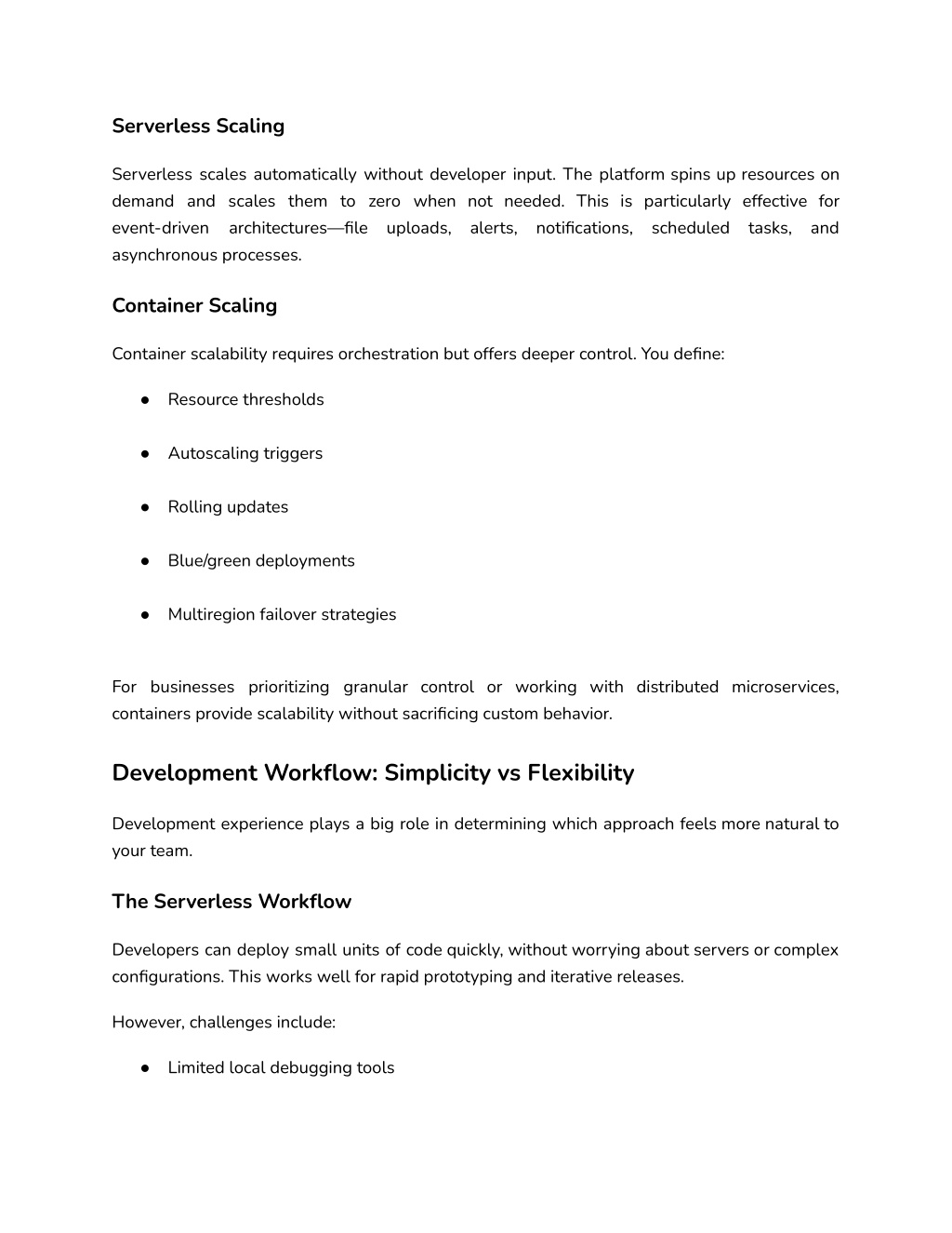 4. Serverless Scaling Serverless scales automatically without developer input. The platform spins up resources on demand and scales them to zero when not needed. This is particularly effective for event-driven architectures—file uploads, alerts, notifications, scheduled tasks, and asynchronous processes. Container Scaling Container scalability requires orchestration but offers deeper control. You define: ● Resource thresholds ● Autoscaling triggers ● Rolling updates ● Blue/green deployments ● Multiregion failover strategies For businesses prioritizing granular control or working with distributed microservices, containers provide scalability without sacrificing custom behavior. Development Workflow: Simplicity vs Flexibility Development experience plays a big role in determining which approach feels more natural to your team. The Serverless Workflow Developers can deploy small units of code quickly, without worrying about servers or complex configurations. This works well for rapid prototyping and iterative releases. However, challenges include: ● Limited local debugging tools