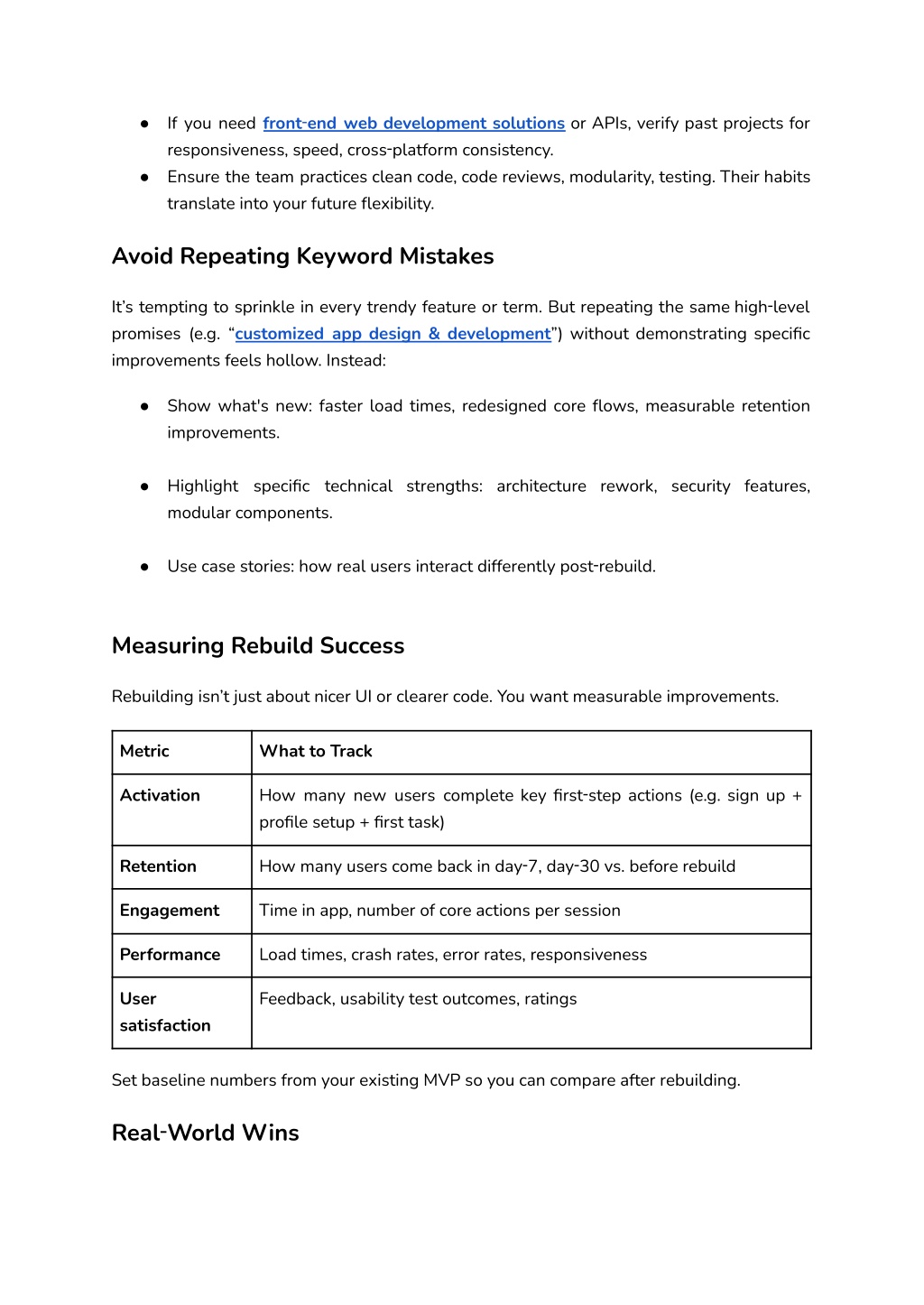 4. ● If you need front‑end web development solutions or APIs, verify past projects for responsiveness, speed, cross‑platform consistency. ● Ensure the team practices clean code, code reviews, modularity, testing. Their habits translate into your future flexibility. Avoid Repeating Keyword Mistakes It’s tempting to sprinkle in every trendy feature or term. But repeating the same high‑level promises (e.g. “customized app design & development”) without demonstrating specific improvements feels hollow. Instead: ● Show what's new: faster load times, redesigned core flows, measurable retention improvements. ● Highlight specific technical strengths: architecture rework, security features, modular components. ● Use case stories: how real users interact differently post‑rebuild. Measuring Rebuild Success Rebuilding isn’t just about nicer UI or clearer code. You want measurable improvements. Metric What to Track Activation How many new users complete key first‑step actions (e.g. sign up + profile setup + first task) Retention How many users come back in day‑7, day‑30 vs. before rebuild Engagement Time in app, number of core actions per session Performance Load times, crash rates, error rates, responsiveness User satisfaction Feedback, usability test outcomes, ratings Set baseline numbers from your existing MVP so you can compare after rebuilding. Real‑World Wins