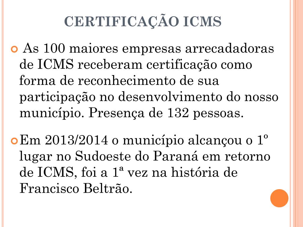 CERTIFICAÇÃO ICMS • As 100 maiores empresas arrecadadoras de ICMS receberam certificação como forma de reconhecimento de sua participação no desenvolvimento do nosso município. Presença de 132 pessoas. • Em 2013/2014 o município alcançou o 1º lugar no Sudoeste do Paraná em retorno de ICMS, foi a 1ª vez na história de Francisco Beltrão.
