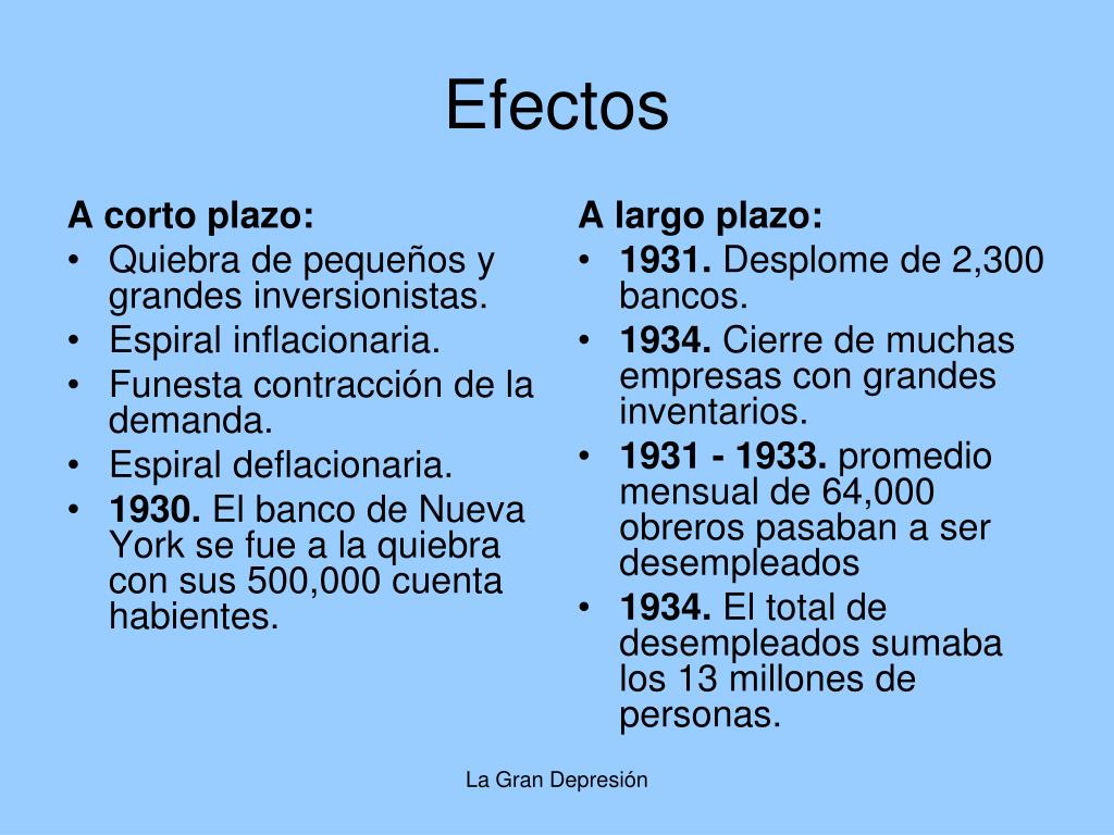 A corto plazo: Quiebra de pequeños y grandes inversionistas. Espiral inflacionaria. Funesta contracción de la demanda. Espiral deflacionaria. 1930. El banco de Nueva York se fue a la quiebra con sus 500,000 cuenta habientes. A largo plazo: 1931. Desplome de 2,300 bancos. 1934. Cierre de muchas empresas con grandes inventarios. 1931 - 1933. promedio mensual de 64,000 obreros pasaban a ser desempleados 1934. El total de desempleados sumaba los 13 millones de personas. Efectos La Gran Depresión