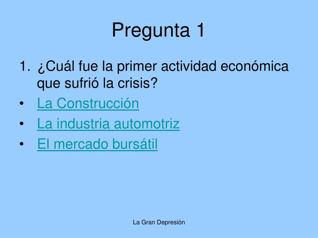 Pregunta 1 • ¿Cuál fue la primer actividad económica que sufrió la crisis? • La Construcción • La industria automotriz • El mercado bursátil La Gran Depresión
