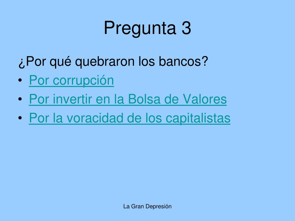 Pregunta 3 ¿Por qué quebraron los bancos? • Por corrupción • Por invertir en la Bolsa de Valores • Por la voracidad de los capitalistas La Gran Depresión