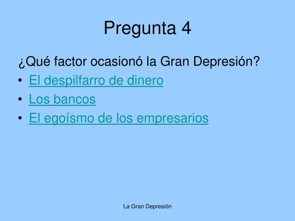 Pregunta 4 ¿Qué factor ocasionó la Gran Depresión? • El despilfarro de dinero • Los bancos • El egoísmo de los empresarios La Gran Depresión