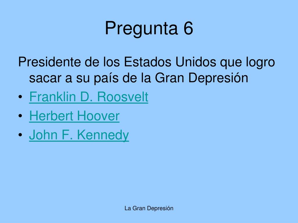 Pregunta 6 Presidente de los Estados Unidos que logro sacar a su país de la Gran Depresión • Franklin D. Roosvelt • Herbert Hoover • John F. Kennedy La Gran Depresión