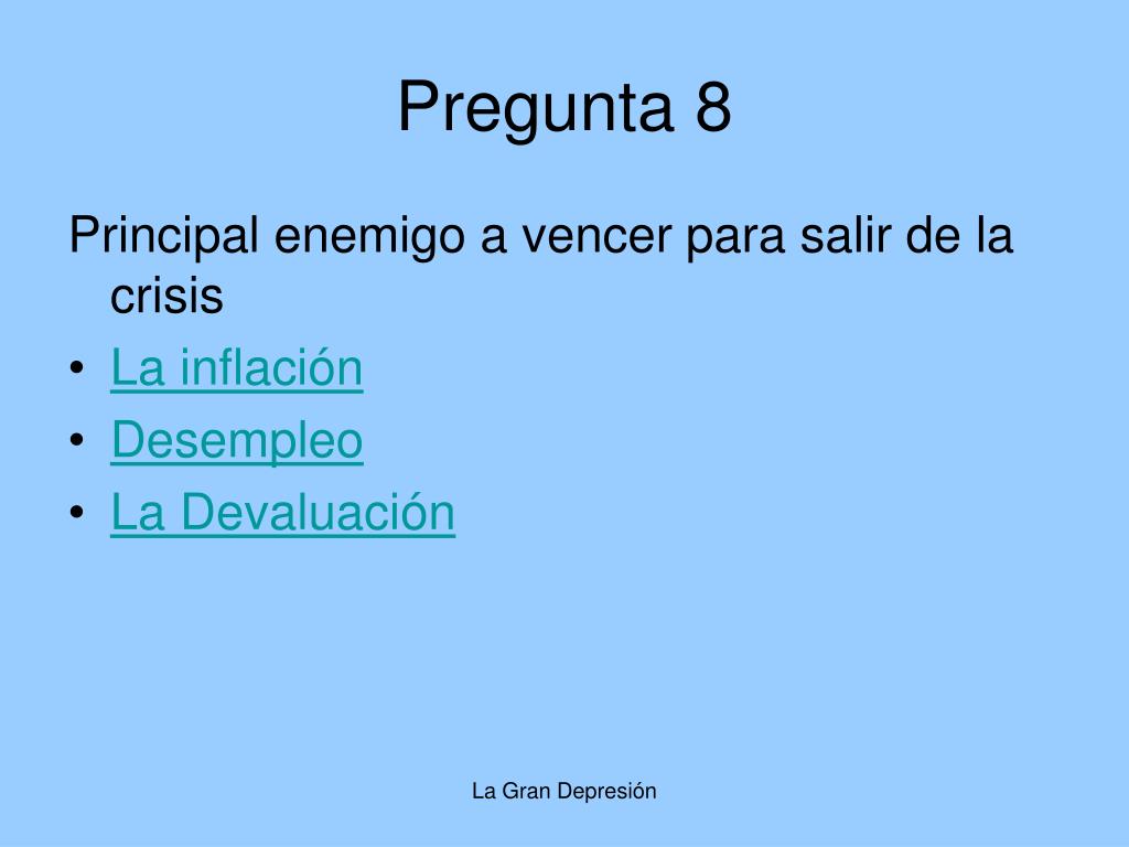 Pregunta 8 Principal enemigo a vencer para salir de la crisis • La inflación • Desempleo • La Devaluación La Gran Depresión