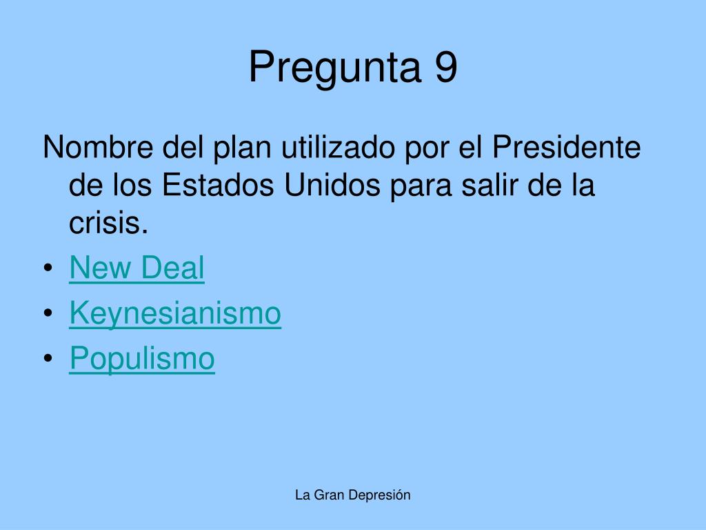Pregunta 9 Nombre del plan utilizado por el Presidente de los Estados Unidos para salir de la crisis. • New Deal • Keynesianismo • Populismo La Gran Depresión