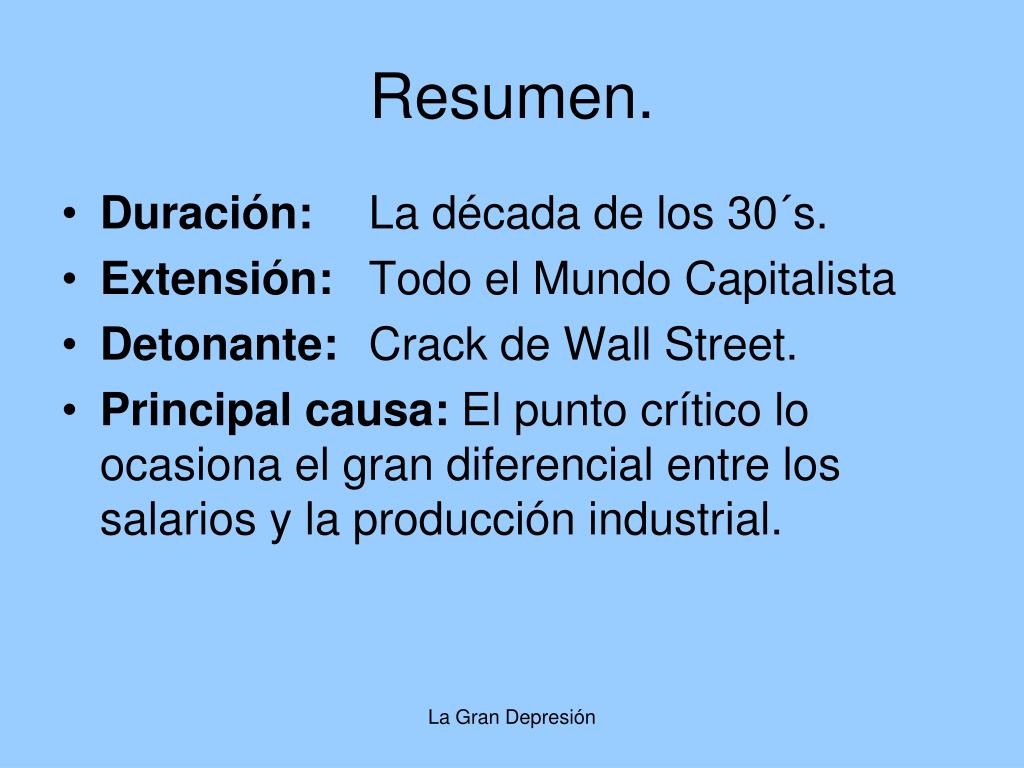 Resumen. • Duración: La década de los 30´s. • Extensión: Todo el Mundo Capitalista • Detonante: Crack de Wall Street. • Principal causa: El punto crítico lo ocasiona el gran diferencial entre los salarios y la producción industrial. La Gran Depresión