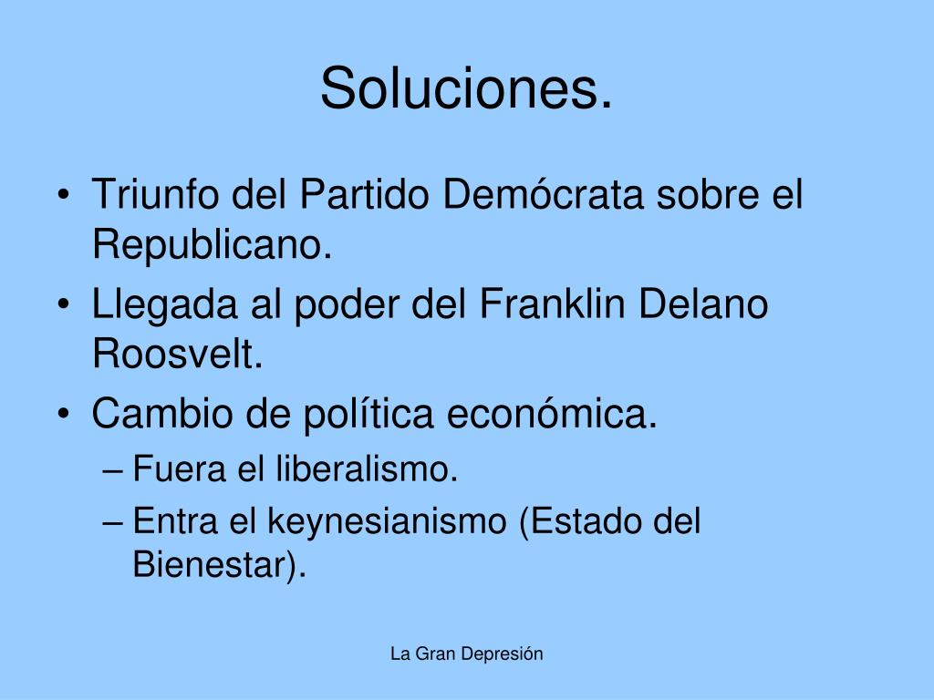 Soluciones. • Triunfo del Partido Demócrata sobre el Republicano. • Llegada al poder del Franklin Delano Roosvelt. • Cambio de política económica. • Fuera el liberalismo. • Entra el keynesianismo (Estado del Bienestar). La Gran Depresión