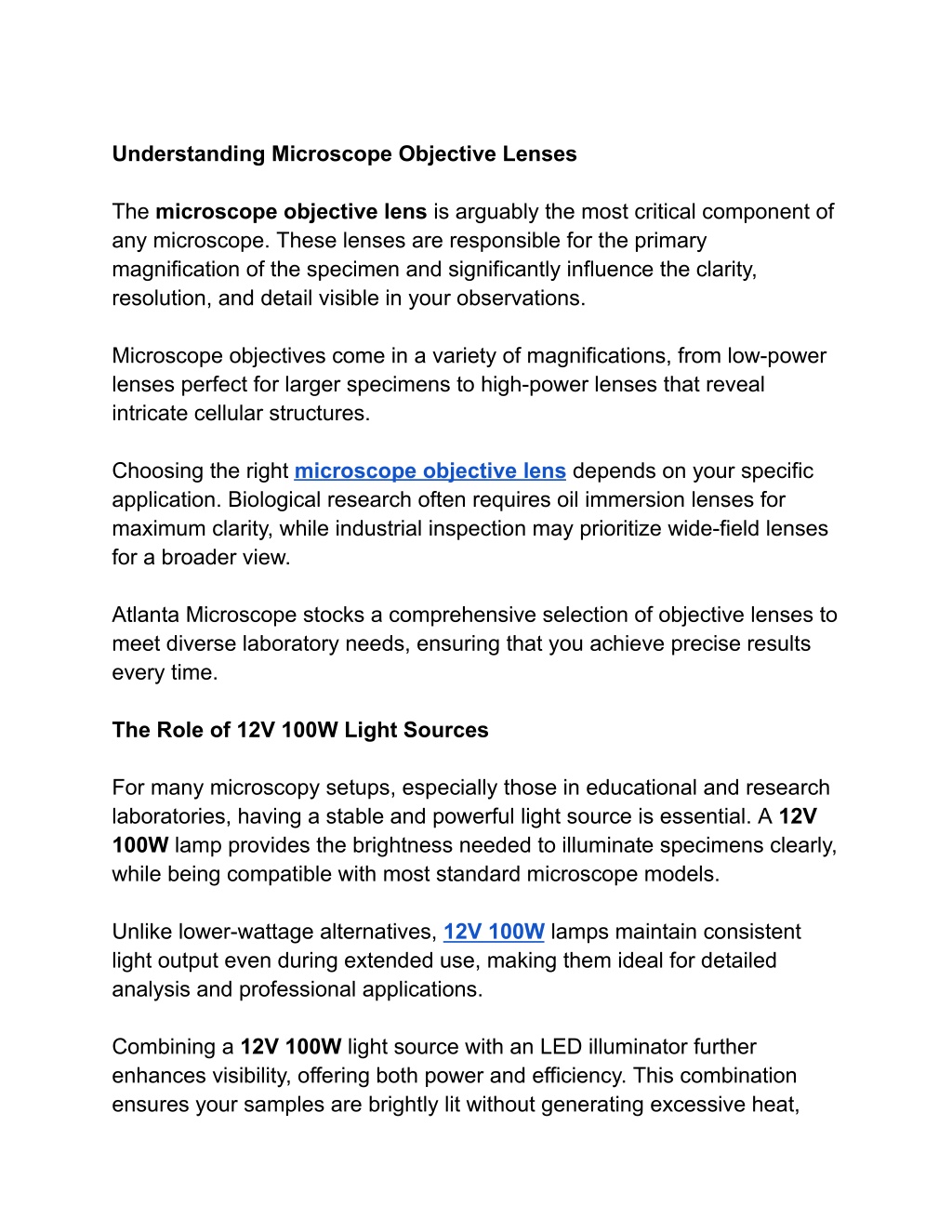 Understanding Microscope Objective Lenses The microscope objective lens is arguably the most critical component of any microscope. These lenses are responsible for the primary magnification of the specimen and significantly influence the clarity, resolution, and detail visible in your observations. Microscope objectives come in a variety of magnifications, from low-power lenses perfect for larger specimens to high-power lenses that reveal intricate cellular structures. Choosing the right microscope objective lens depends on your specific application. Biological research often requires oil immersion lenses for maximum clarity, while industrial inspection may prioritize wide-field lenses for a broader view. Atlanta Microscope stocks a comprehensive selection of objective lenses to meet diverse laboratory needs, ensuring that you achieve precise results every time. The Role of 12V 100W Light Sources For many microscopy setups, especially those in educational and research laboratories, having a stable and powerful light source is essential. A 12V 100W lamp provides the brightness needed to illuminate specimens clearly, while being compatible with most standard microscope models. Unlike lower-wattage alternatives, 12V 100W lamps maintain consistent light output even during extended use, making them ideal for detailed analysis and professional applications. Combining a 12V 100W light source with an LED illuminator further enhances visibility, offering both power and efficiency. This combination ensures your samples are brightly lit without generating excessive heat,