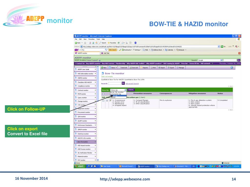BOW-TIE & HAZID monitor Click on Follow-UP Click on export Convert to Excel file http://adepp.webexone.com