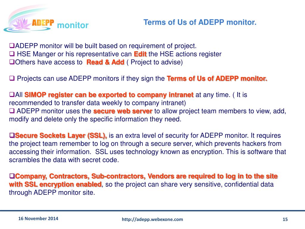 Terms of Us of ADEPP monitor. • ADEPP monitor will be built based on requirement of project. • HSE Manger or his representative can Edit the HSE actions register • Others have access to Read & Add ( Project to advise) • Projects can use ADEPP monitors if they sign the Terms of Us of ADEPP monitor. • All SIMOP register can beexported to company intranet at any time. ( It is recommended to transfer data weekly to company intranet) • ADEPP monitor uses the secure web server to allow project team members to view, add, modify and delete only the specific information they need. • Secure Sockets Layer (SSL), is an extra level of security for ADEPP monitor. It requires the project team remember to log on through a secure server, which prevents hackers from accessing their information. SSL uses technology known as encryption. This is software that scrambles the data with secret code. • Company, Contractors, Sub-contractors, Vendors are required to log in to the site with SSL encryption enabled, so the project can share very sensitive, confidential data through ADEPP monitor site. http://adepp.webexone.com