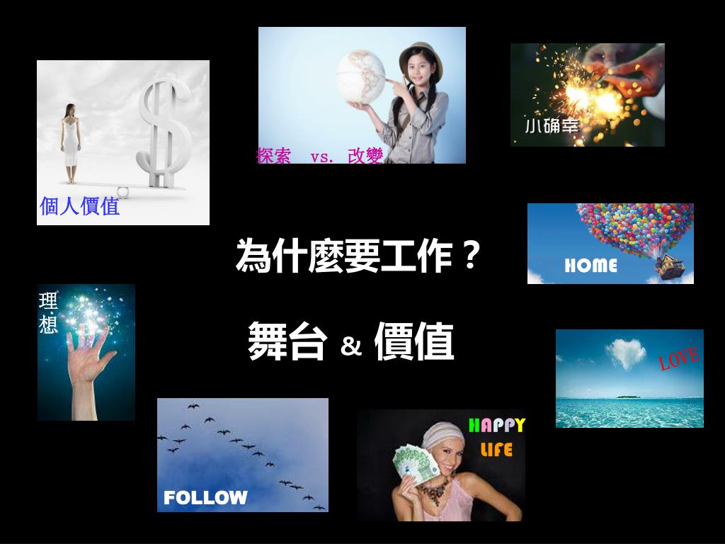 LOVE HOME 為什麼要工作? 探索 vs. 改變 理想 舞台 & 價值 HAPPY LIFE FOLLOW 個人價值