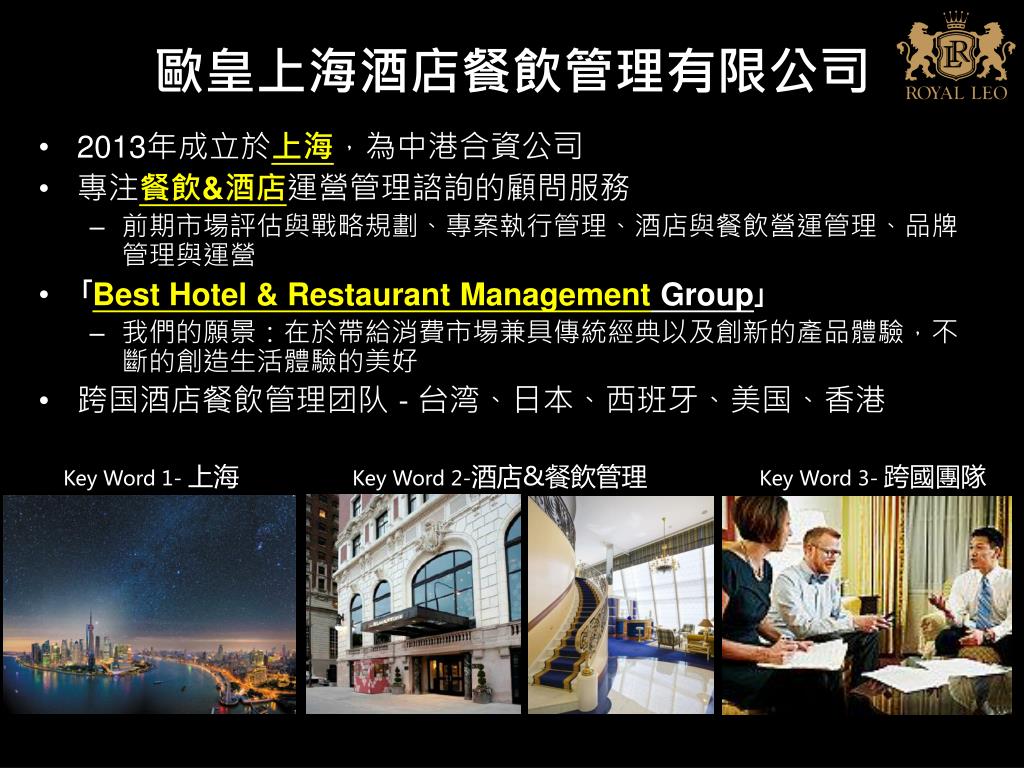 歐皇上海酒店餐飲管理有限公司 • 2013年成立於上海,為中港合資公司 • 專注餐飲&酒店運營管理諮詢的顧問服務 • 前期市場評估與戰略規劃、專案執行管理、酒店與餐飲營運管理、品牌管理與運營 • 「Best Hotel & Restaurant Management Group」 • 我們的願景:在於帶給消費市場兼具傳統經典以及創新的產品體驗,不斷的創造生活體驗的美好 • 跨国酒店餐飲管理团队 - 台湾、日本、西班牙、美国、香港 Key Word 1- 上海 Key Word 2-酒店&餐飲管理 Key Word 3- 跨國團隊