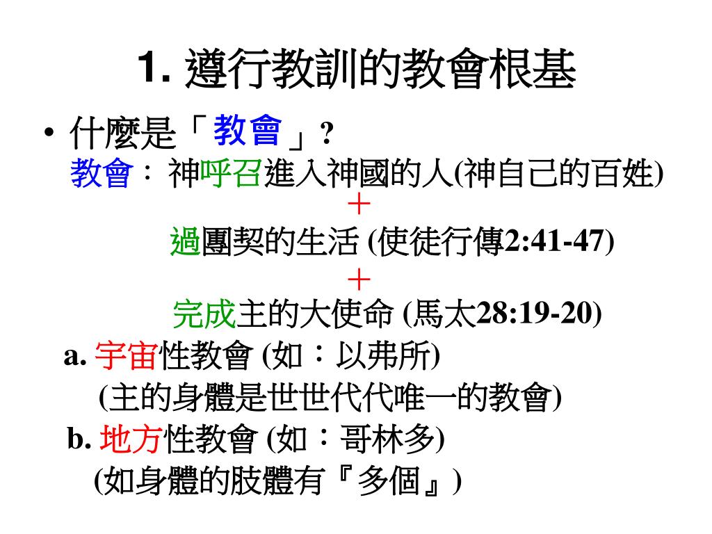 1. 遵行教訓的教會根基 • 什麼是「教會」? 教會: 神呼召進入神國的人(神自己的百姓) + 過團契的生活 (使徒行傳2:41-47) + 完成主的大使命 (馬太28:19-20) a. 宇宙性教會 (如:以弗所) (主的身體是世世代代唯一的教會) b. 地方性教會 (如:哥林多) (如身體的肢體有『多個』)