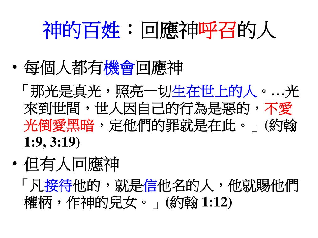 神的百姓:回應神呼召的人 • 每個人都有機會回應神 「那光是真光,照亮一切生在世上的人。…光來到世間,世人因自己的行為是惡的,不愛光倒愛黑暗,定他們的罪就是在此。」(約翰 1:9, 3:19) • 但有人回應神 「凡接待他的,就是信他名的人,他就賜他們權柄,作神的兒女。」(約翰 1:12)