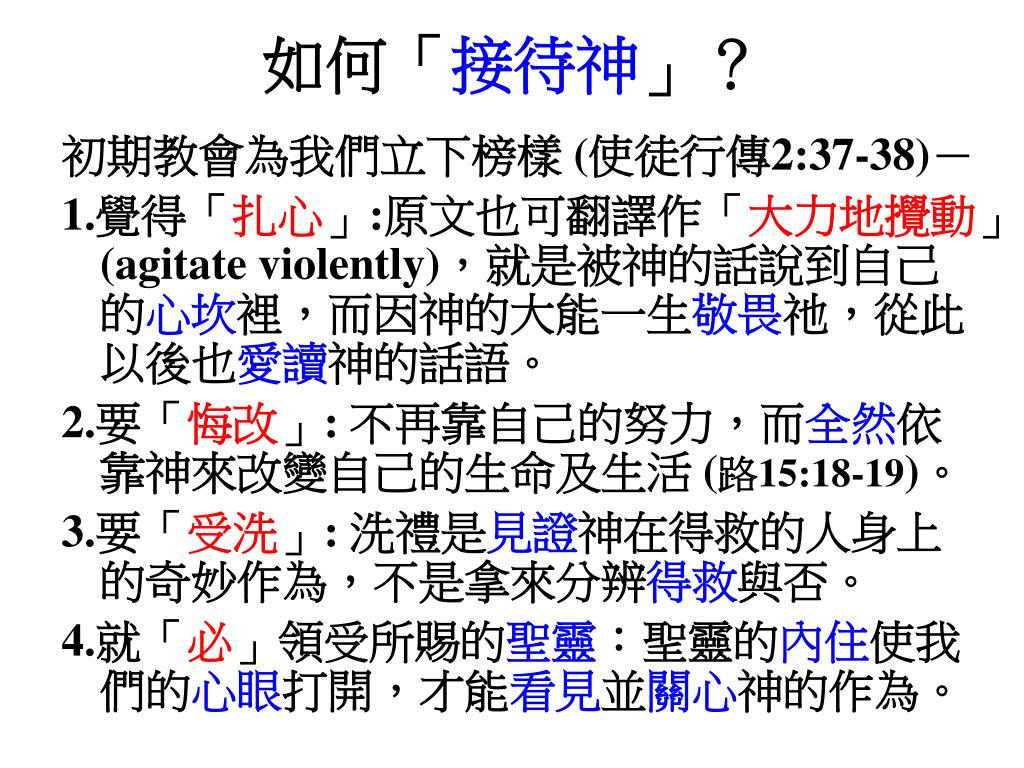如何「接待神」? 初期教會為我們立下榜樣 (使徒行傳2:37-38)- 1.覺得「扎心」:原文也可翻譯作「大力地攪動」(agitate violently),就是被神的話說到自己的心坎裡,而因神的大能一生敬畏祂,從此以後也愛讀神的話語。 2.要「悔改」: 不再靠自己的努力,而全然依靠神來改變自己的生命及生活 (路15:18-19)。 3.要「受洗」: 洗禮是見證神在得救的人身上的奇妙作為,不是拿來分辨得救與否。 4.就「必」領受所賜的聖靈:聖靈的內住使我們的心眼打開,才能看見並關心神的作為。