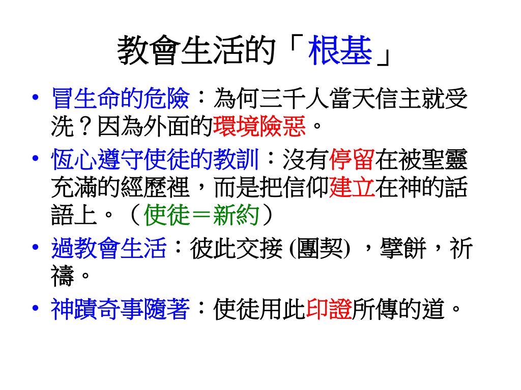 教會生活的「根基」 • 冒生命的危險:為何三千人當天信主就受洗?因為外面的環境險惡。 • 恆心遵守使徒的教訓:沒有停留在被聖靈充滿的經歷裡,而是把信仰建立在神的話語上。(使徒=新約) • 過教會生活:彼此交接 (團契),擘餅,祈禱。 • 神蹟奇事隨著:使徒用此印證所傳的道。