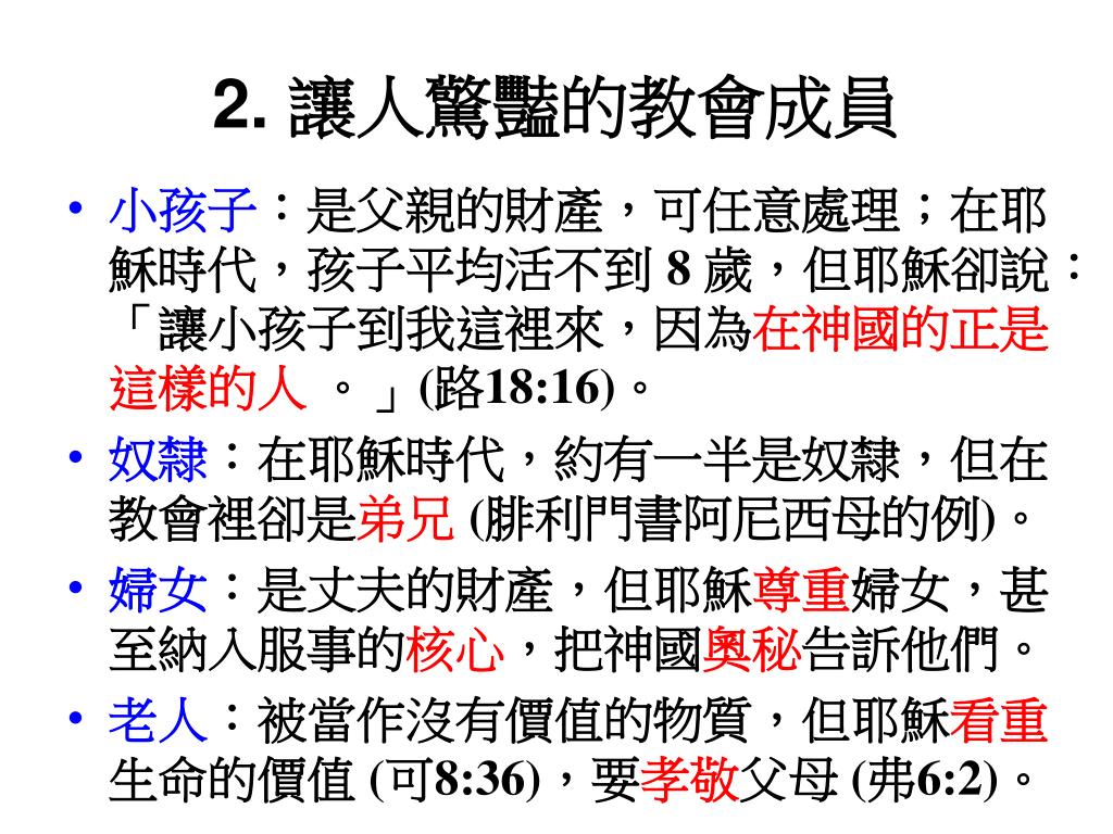 2. 讓人驚豔的教會成員 • 小孩子:是父親的財產,可任意處理;在耶穌時代,孩子平均活不到 8 歲,但耶穌卻說:「讓小孩子到我這裡來,因為在神國的正是這樣的人 。」(路18:16)。 • 奴隸:在耶穌時代,約有一半是奴隸,但在教會裡卻是弟兄(腓利門書阿尼西母的例)。 • 婦女:是丈夫的財產,但耶穌尊重婦女,甚至納入服事的核心,把神國奧秘告訴他們。 • 老人:被當作沒有價值的物質,但耶穌看重生命的價值(可8:36),要孝敬父母 (弗6:2)。